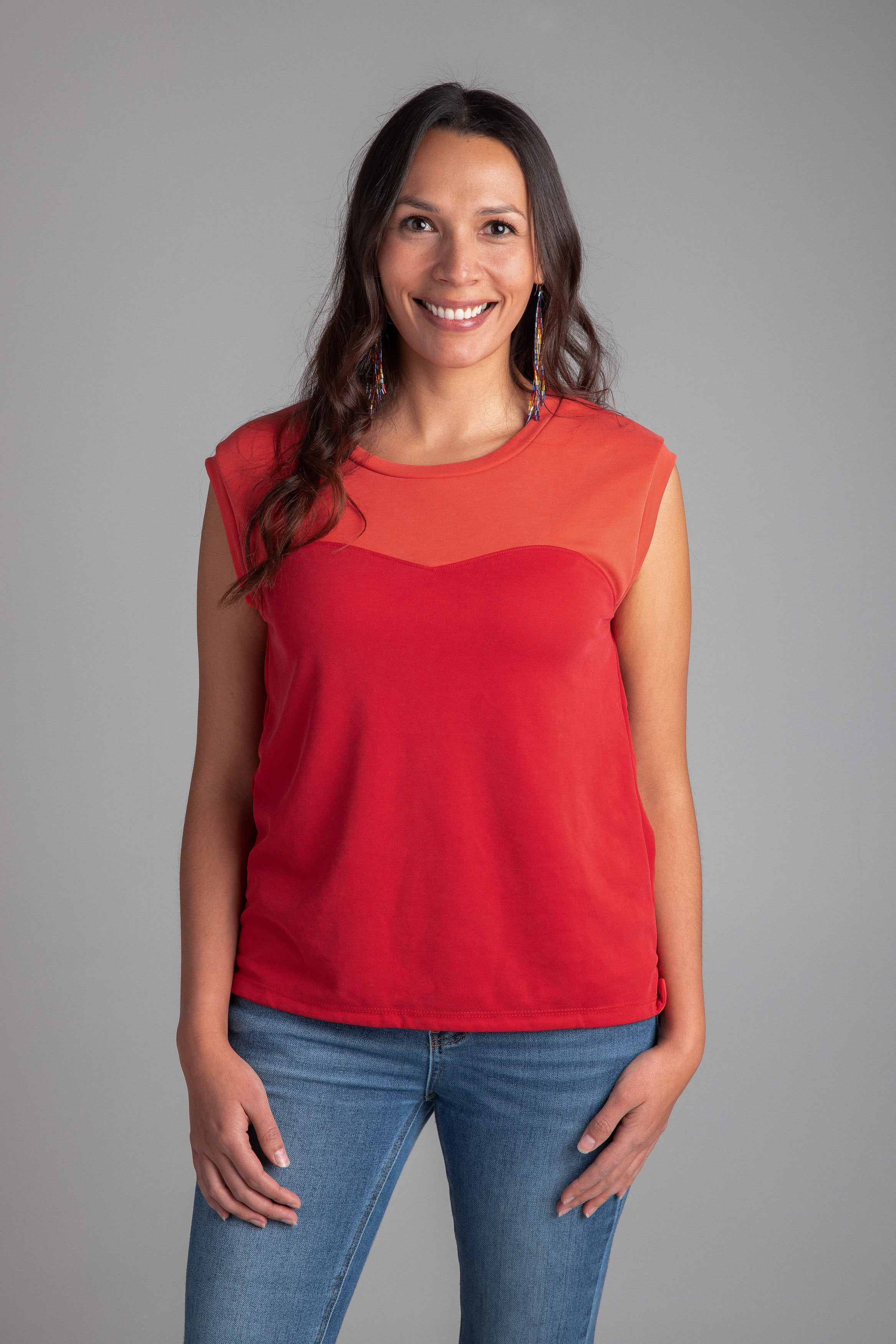 Coral/Red Sweetheart CamisoleThe cap sleeve paired with a satin bustier and complimentary maroon wide legged trousers.