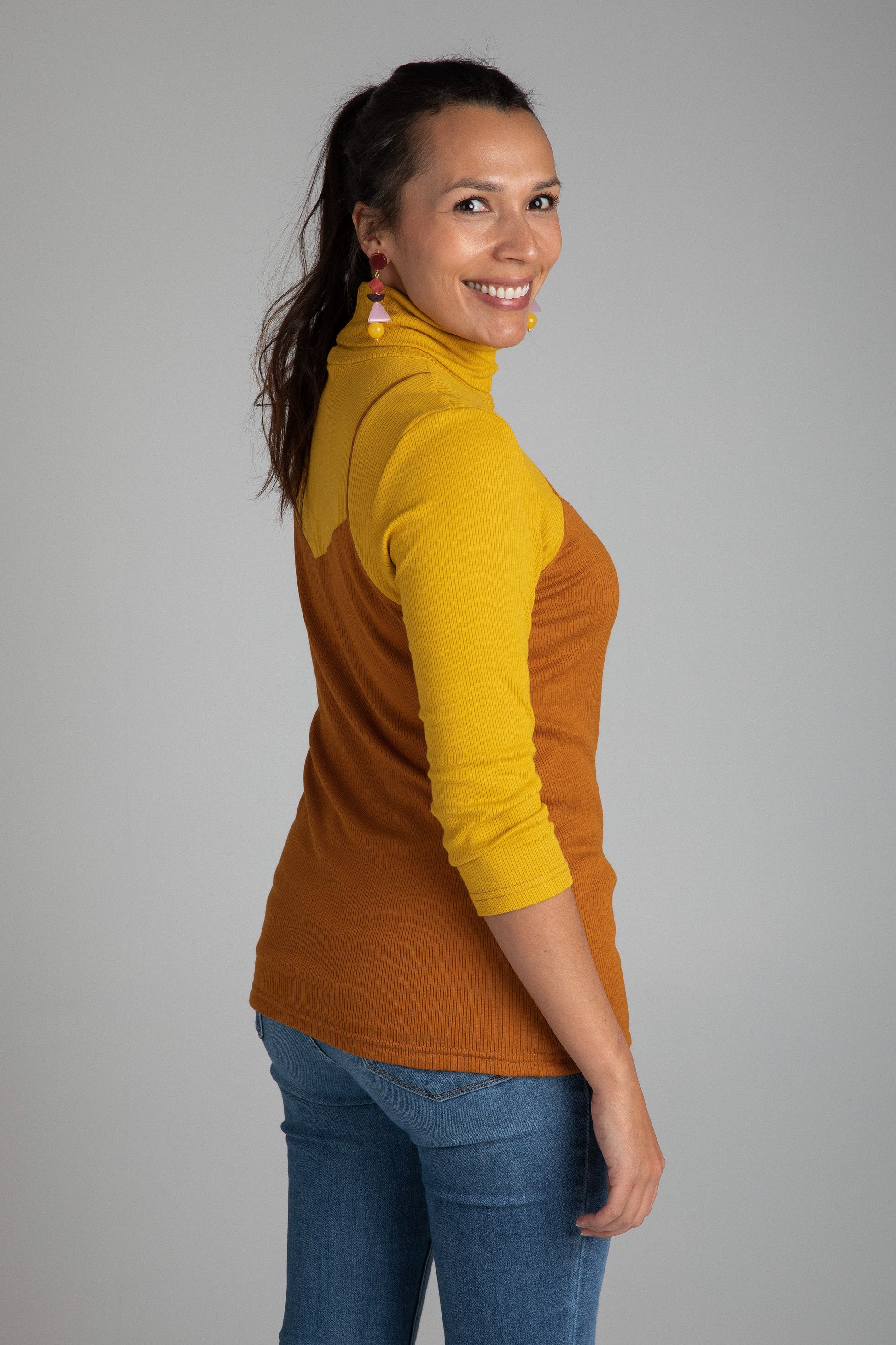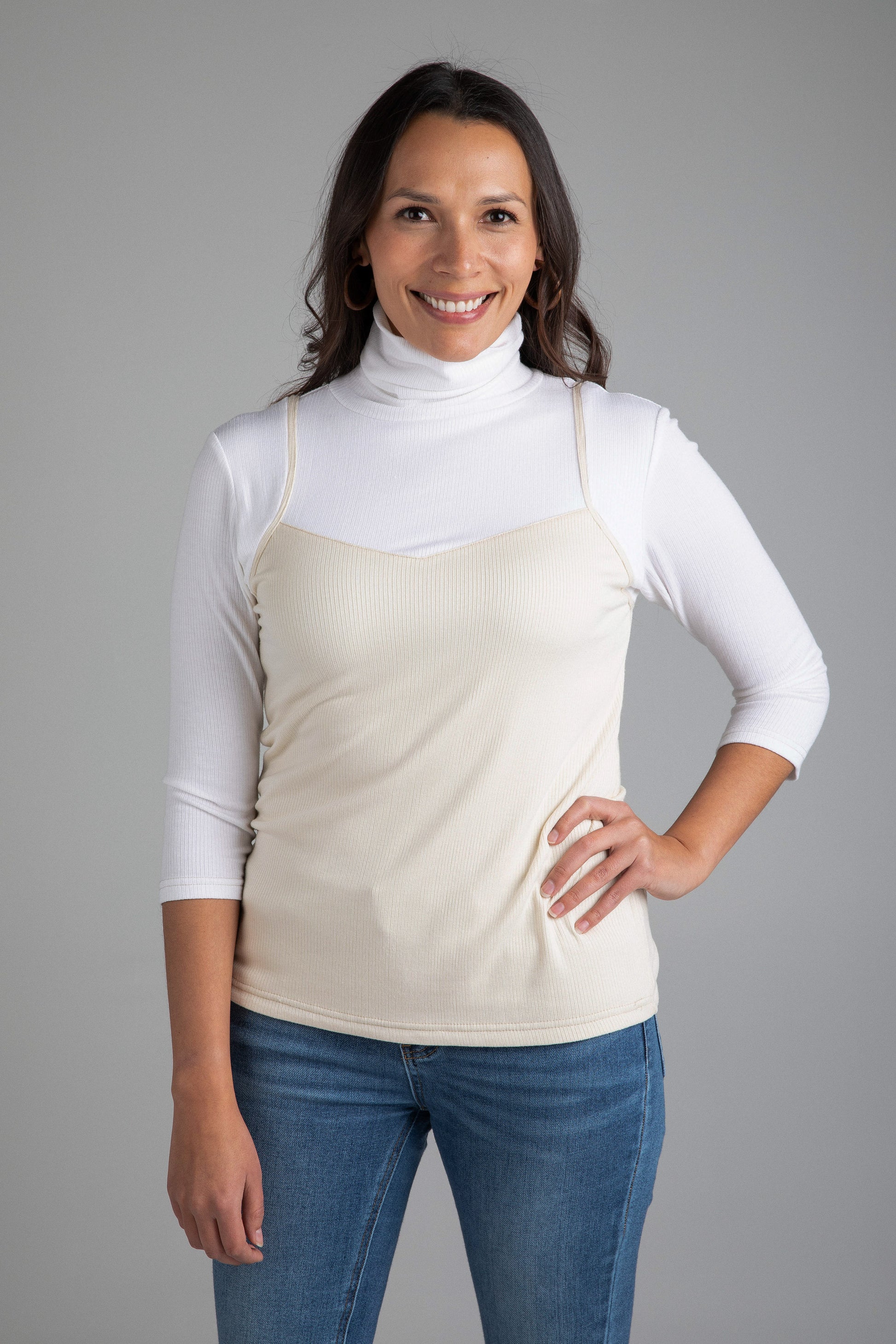 The T-Neck is double layered but perfectly weighted and won’t overheat you. Bracelet length sleeves and a camisole overlay step up this everyday basic. Softer than cotton, this fabric feels like your favorite ribbed vintage tank top.