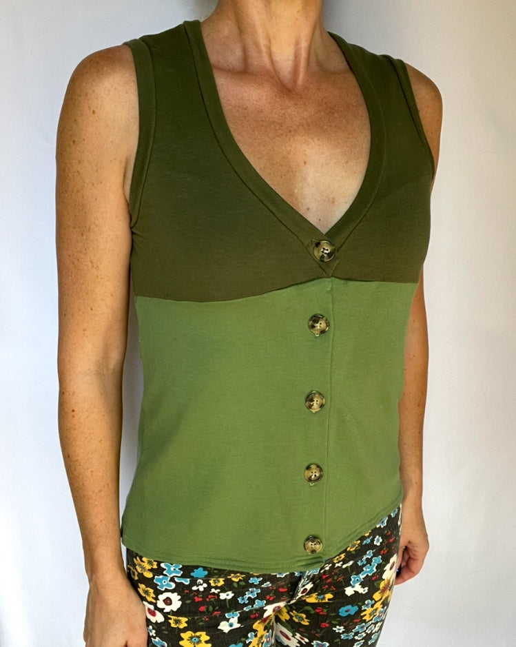 The vest is made from the softest lightweight French terry that is perfect to layer over your favorite t-shirt. Large buttons allow for a quick opening for breastfeeding moms and a lower hemline in the back offers more coverage. Tortoise shell colored buttons are made from upcycled horn that has been discarded naturally.